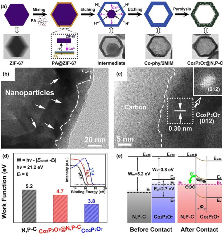 图5. (a)Co₂P₂O₇@N,P-C纳米笼的制备经由默示图。(b)Co₂P₂O₇@N,P-C纳米笼的透射电子显微镜(TEM)图像。(c)高分辨透射电子显微镜(HRTEM)图像。(d)Co₂P₂O₇、N,P-C及Co₂P₂O₇@N,P-C的功函数值(插图为对应的UPS光谱);(e)Co₂P₂O₇与N,P-C之间异质结的能带默示图(Evac=真空能级,Ec=导带,Ev=价带,Ef=费米能级,Eg=带隙,W=功函数,Φ=铺张层)。DOI: 10.1016/j.apcatb.2019.118417