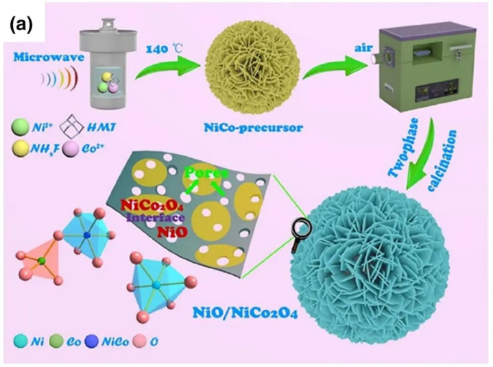 图4. (a)两步煅烧NiCo双金属先行者体制备多孔纳米NiO/NiCo₂O₄异质结构默示图,先行者体由微波扶助水热法合成。DOI: 10.1016/j.mattod.2021.02.004