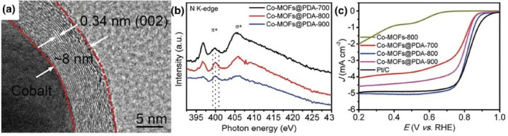 图8.(a)Co-MOFs@PDA-800的高分辨TEM图像。(b)Co-MOFs@PDA-n的N K边X射线经受近边结构(XANES)。(c)各种品O₂鼓胀0.1M KOH溶液、1600rpm转速下的ORR线性扫描伏安(LSV)弧线。DOI: 10.1002/smll.201702074