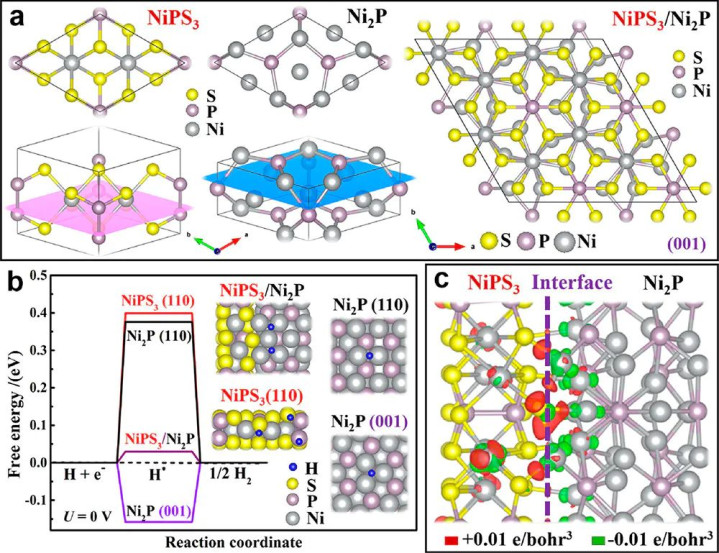图7. (a)默示模子展示NiPS₃与Ni₂P之间的晶格匹配情况。(b)在均衡电位(U= 0V)下策划的NiPS₃/Ni₂P、Ni₂P(001)、Ni₂P(110)和NiPS₃(110)的ΔGH*,插图给出H*吸附的DFT优化构型。(c)NiPS₃/Ni₂P界面的电荷密度差散布,红色(绿色)别离线路电子积蓄(Δρ=+0.01e·bohr⁻³)和铺张(Δρ=−0.01e·bohr⁻³);Ni、S、P、H原子别离以灰色、黄色、紫色、蓝色标示。DOI: 10.1021/acsnano.9b02510