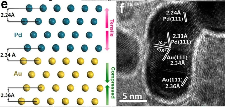 图6.(e)晶体结构默示图及(f)HRTEM图像,明晰展示Pd-Au晶格。DOI: 10.1016/j.cej.2020.124240
