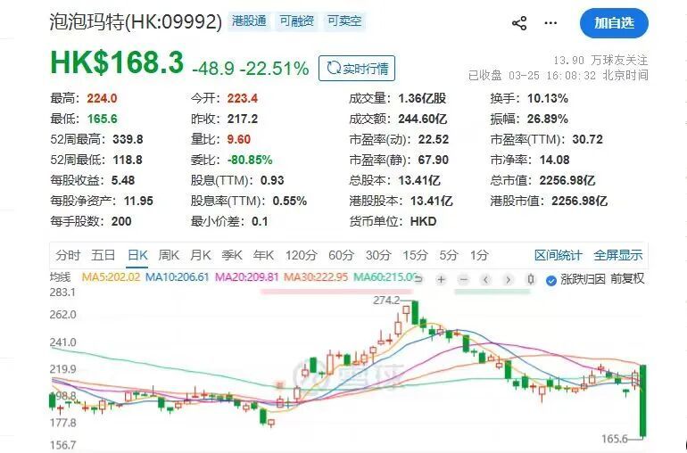 事迹发布的同日,3月25日,泡泡玛特在港股际遇“杀跌”。适度收盘,该公司报168.3港元/股,当日跌幅达22.51%,共跌去48.9港元/股。同日委比-80.85%,成交量1.36亿股,成交额244.60亿港元,最新市值2256.98亿港元。