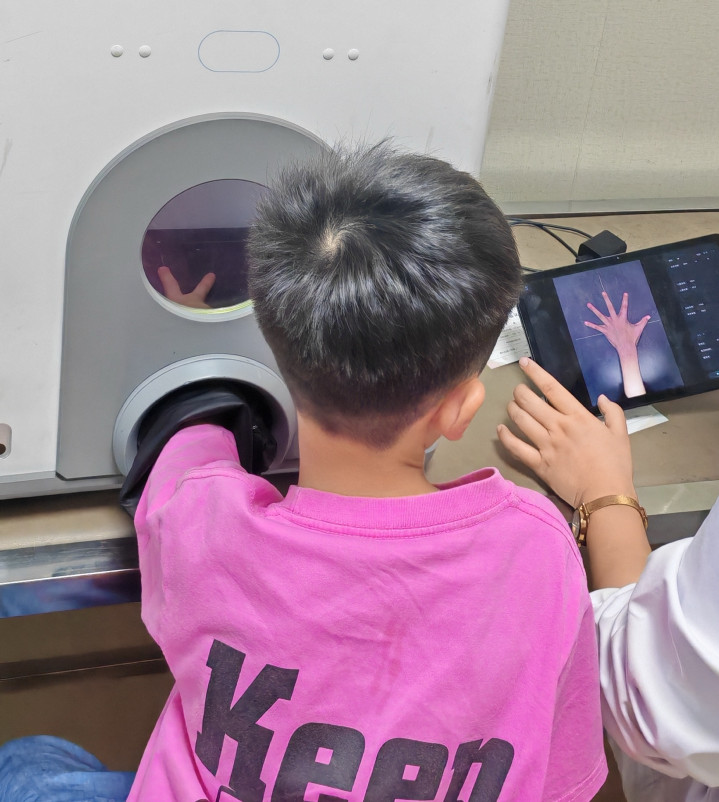 操作:带孩子去病院拍摄左手腕骨X光片。