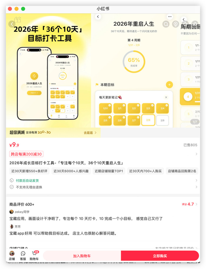 离职后的她对准女性成长赛说念,在小红书作念起执行博主。但变现之难超乎思象:赛说念实足、告白稀缺,2300粉丝的账号难以守旧收入。“必须作念居品!”她将见解投向蓄意类器用,却发现Notion、多维表格等赛说念已拥堵不胜。惟恐间,她搏斗到“36个10天”的见解——将一年365天的方针拆解为短期可扩充单位,她灵感迸发:“用户真的需要的是低门槛的打卡,而非深广蓄意!”这个知悉,让她找到了冲破口。