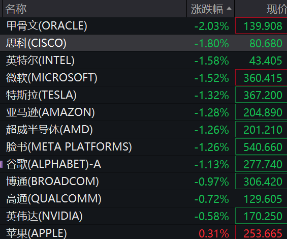 好意思股科技股大齐下落,甲骨文跌超2%,念念科、英特尔、微软、特斯拉、亚马逊跌超1%。